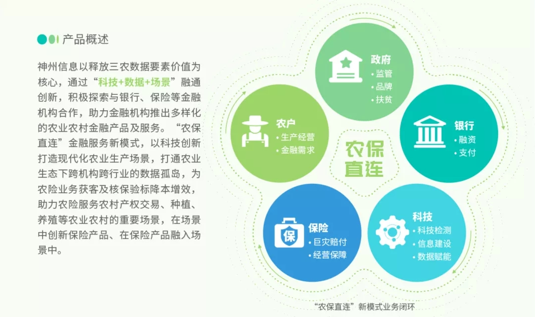 商业模式创新方面:农保直连产品可在农业保险全流程中的应用,为农作物养殖物的承保和理赔、政府监管提供技术支撑,为数字化空间化趋势下的农业保险工作赋能;并积极探索“保险+信贷”、“政+企+保”、“政+企+保+银”等多种创新模式,为农业生产提供保障,为保险公司提供优质场景与客户、助力种养殖险的核保验标的增效降本。