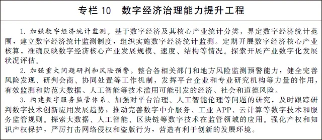 ——数字经济治理体系更加完善。协调统一的数字经济治理框架和规则体系基本建立,跨部门、跨地区的协同监管机制基本健全。政府数字化监管能力显著增强,行业和市场监管水平大幅提升。政府主导、多元参与、法治保障的数字经济治理格局基本形成,治理水平明显提升。与数字经济发展相适应的法律法规制度体系更加完善,数字经济安全体系进一步增强。