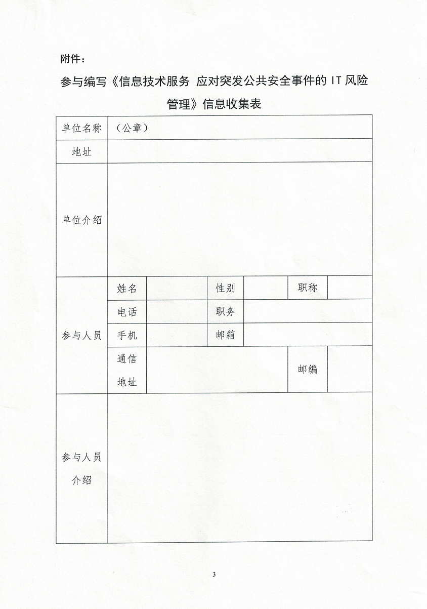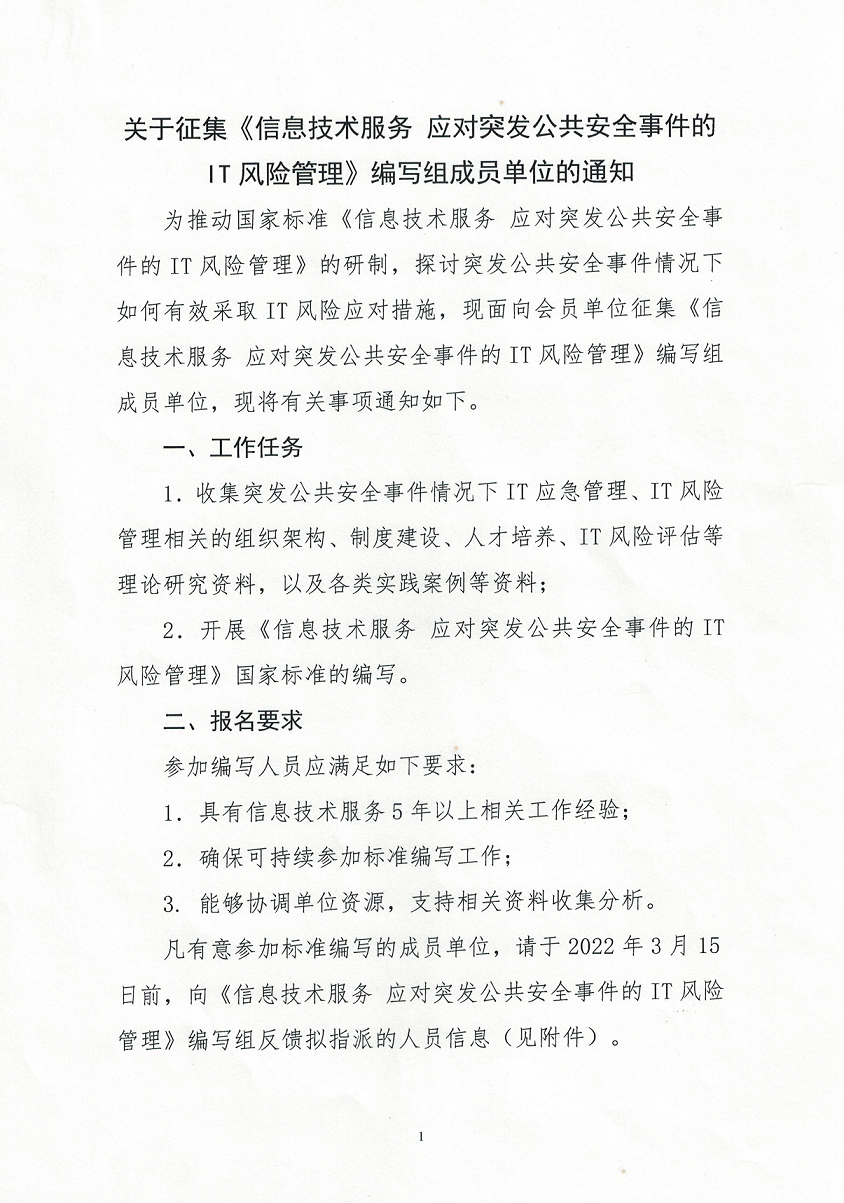 国标《信息技术服务 应对突发公共安全事件的IT风险管理》参编单位征集