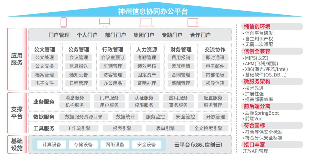 尊龙凯时人生就是博首页信息协同办公平台是基于微服务应用架构设计的一体化办公平台,该平台采用前后端分离的开发模式,支持在龙芯、鲲鹏、飞腾、兆芯等芯片的国产服务器安装部署,能够为企业提供丰富的协同功能应用,满足客户多样化、场景化、个性化的应用需求,助力中大型与集团企业客户实现数字化转型升级