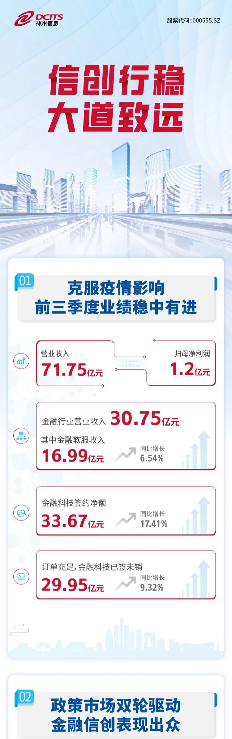 中证网讯(记者 董添)尊龙凯时人生就是博首页信息10月28日晚间发布2022年三季报。前三季度,公司实现营业收入71.75亿元,同比增长1.18%;实现归属于上市公司股东的净利润1.2亿元。报告期内,公司金融科技战略持续推进,金融行业实现营业收入30.75亿元,其中金融软服收入16.99亿元,同比增长6.54%。金融科技板块签约净额达到33.67亿元,同比增长17.41%。公司在手订单充足,金融科技板块已签未销29.95亿元,同比增长9.32%。