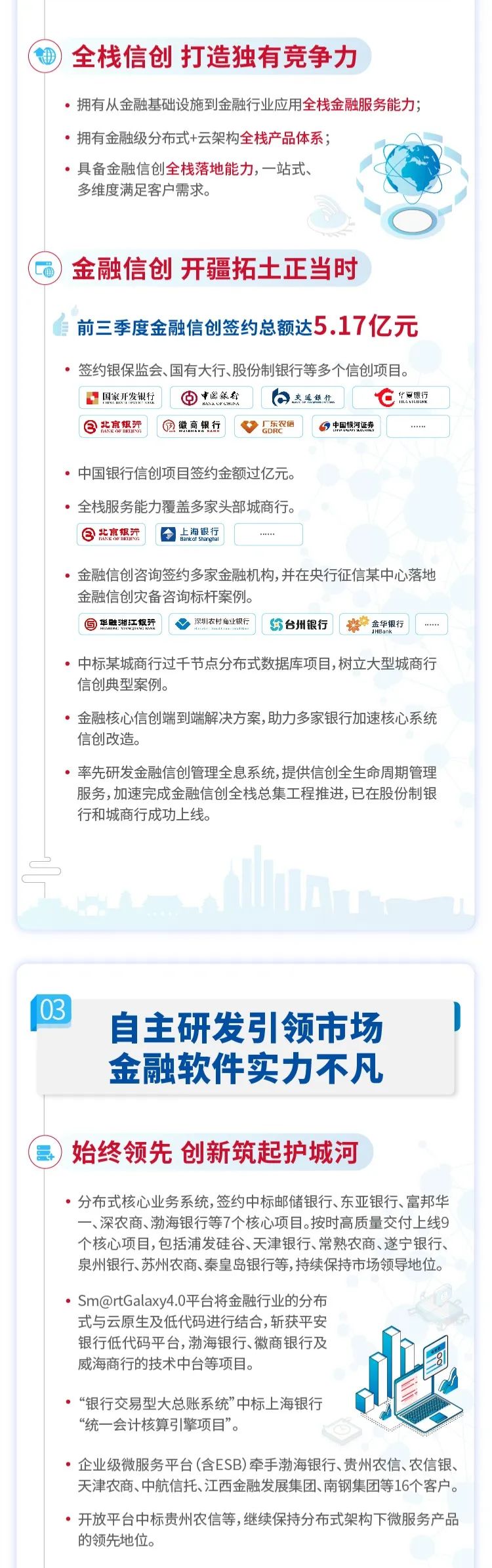 据公司介绍,在金融信创及解决方案领域,公司持续深化与战略客户及生态伙伴之间的合作。同时,公司持续打磨金融信创的全栈能力,为多家银行提供了核心业务系统的信创替代解决方案和落地推动,并提前布局打造了金融信创运维体系和能力,助力金融信创全面加速。